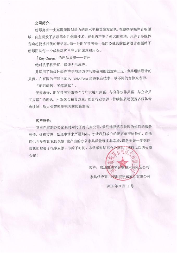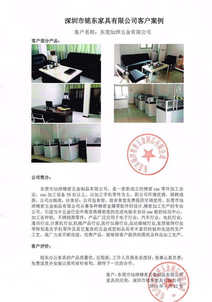 東莞燦燁五金:鑫銘東辦公家具的產品質量優、無瑕疵;工作人員服務態度好;做事認真負責;免費送貨并安裝讓我司省時省利。期待下一次的合作。